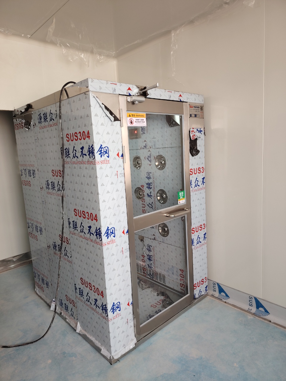 門體安裝:將門體鉸鏈固定于風淋側面廂體。若門框與箱體縫隙不齊平,可能是地面不平導致,需調整風淋下部,墊平底盤,反復調試四角加墊片,直至門體與箱體縫隙整齊。