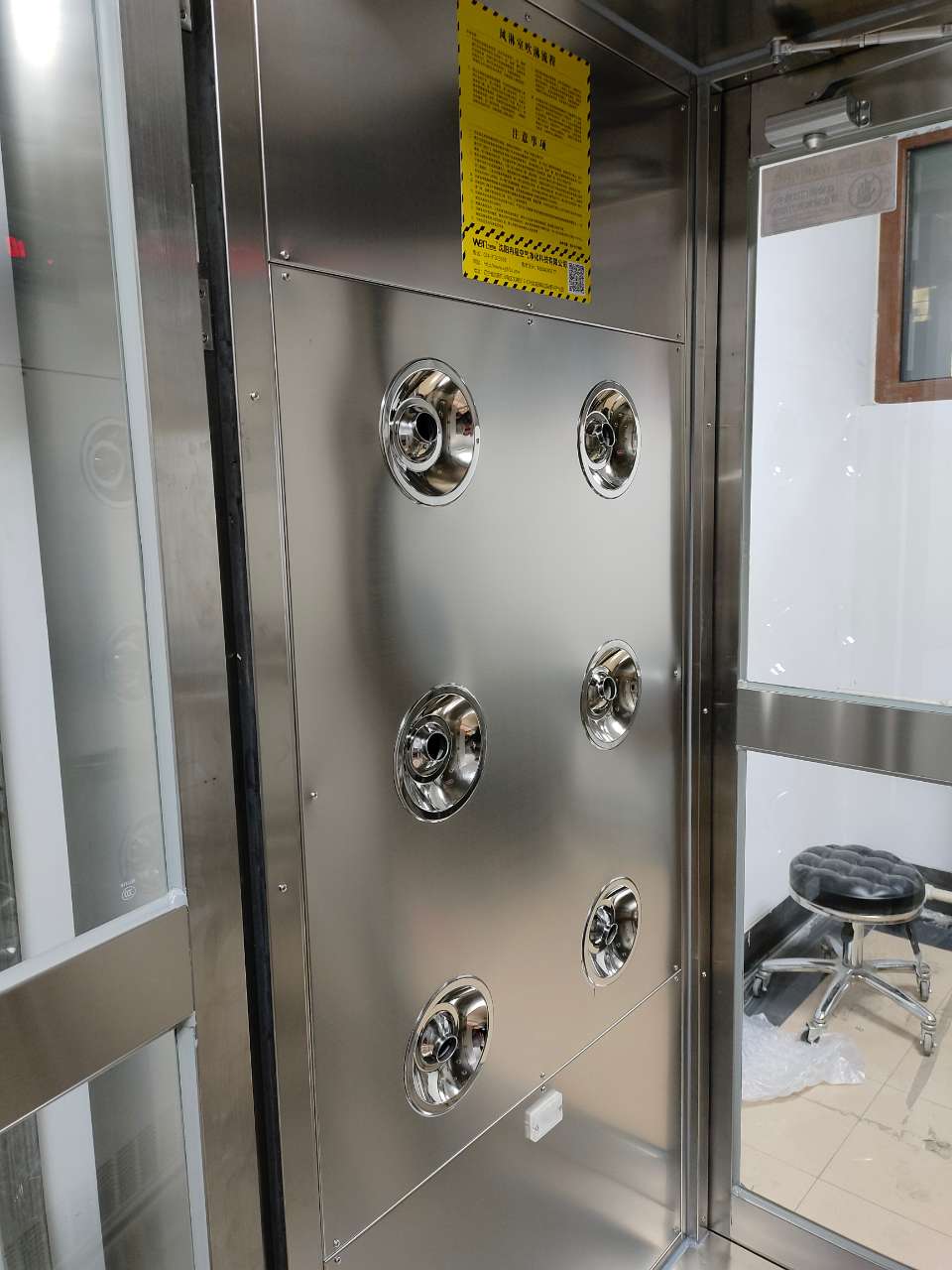 東營風淋室采用空氣過濾器,能夠過濾掉空氣中的微小顆粒物,如塵埃、微生物等,從而顯著提 升環境潔凈度。在一些需要高潔凈環境的場所,如醫藥制造、生物實驗室等,空氣中的塵埃和微生物可能對員工的健康造成影響,風淋室通過吹散人體表面的塵埃和微生物,有效降 低了這種風險。通過減少人員和物品對潔凈室的污染,風淋室有助于保障產品的質量。在潔凈室內進行生產或實驗時,微小的塵?;蛭⑸锒伎赡軐Ξa品造成污染,影響產品的質量和性能,風淋室的使用在很大程度上減少了這些污染。